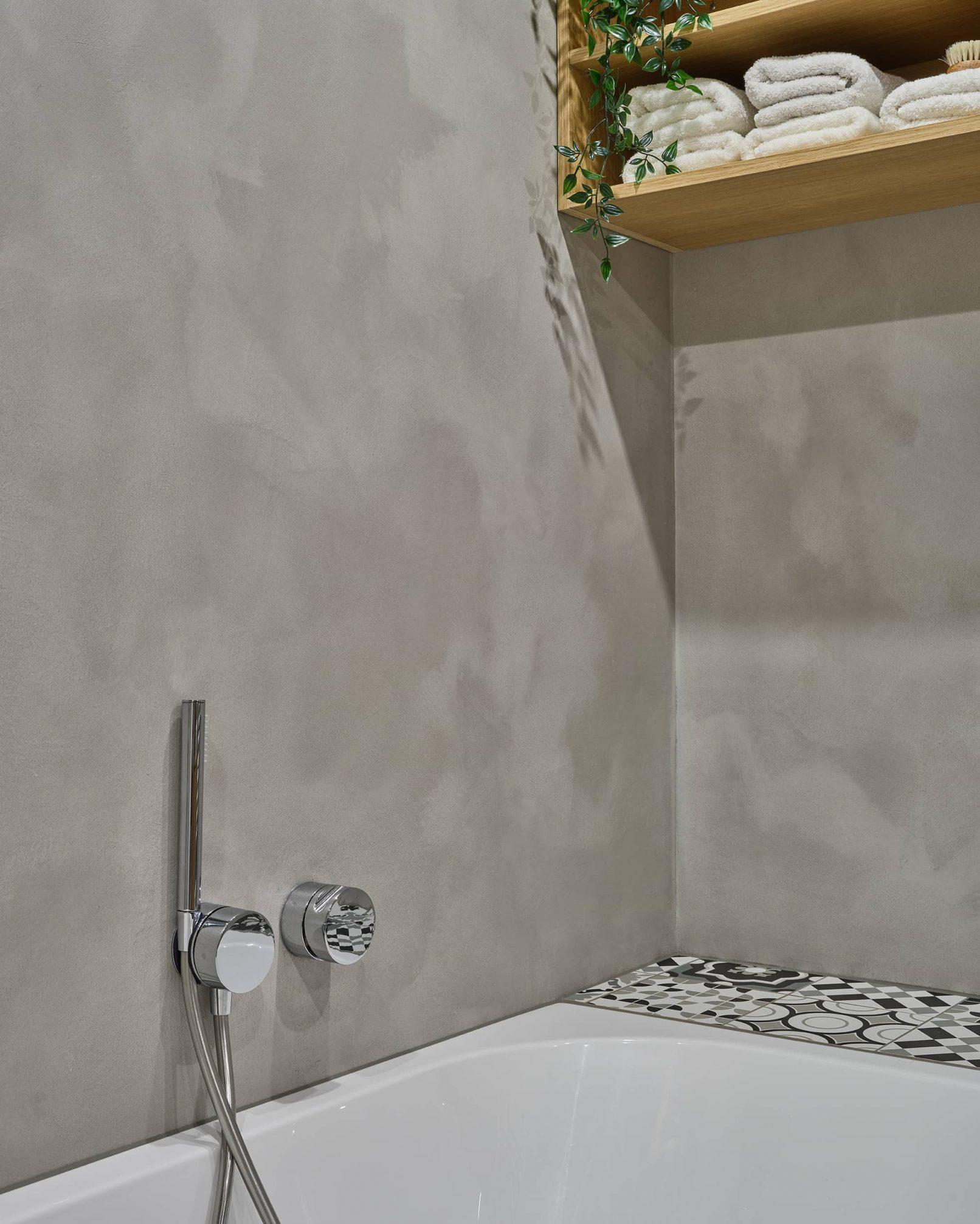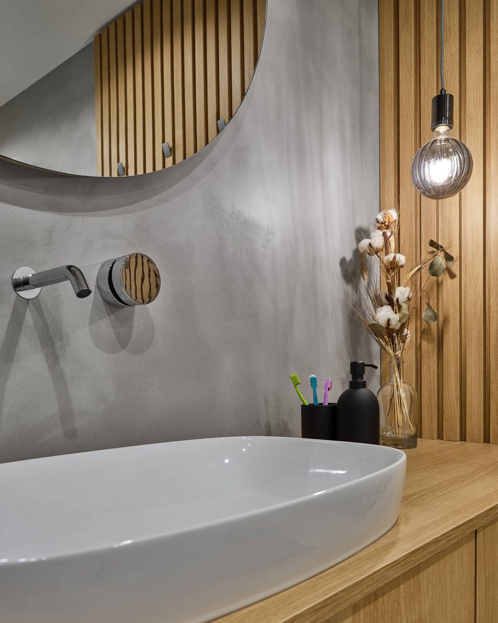 V moderni novogradnji v Šenčurju so si lastniki zaželeli minimalističnih stenskih površin, ki bi bile malo posebne in bi v prostore vnesle dodatno eleganco. V dnevni sobi in v kopalnici smo uporabili enotno rešitev s pomočjo sistema materialov Valpaint, ki je primeren tako za mokre prostore kot glavni prostor v hiši. Ustvarili smo unikaten ambient v osrednjem prostoru, z lakiranjem v kopalnici pa estetsko vodoodbojno površino, ki se lahko čisti in jo je preprosto vzdrževati, deluje pa tudi lahko strukturirano in gladko.