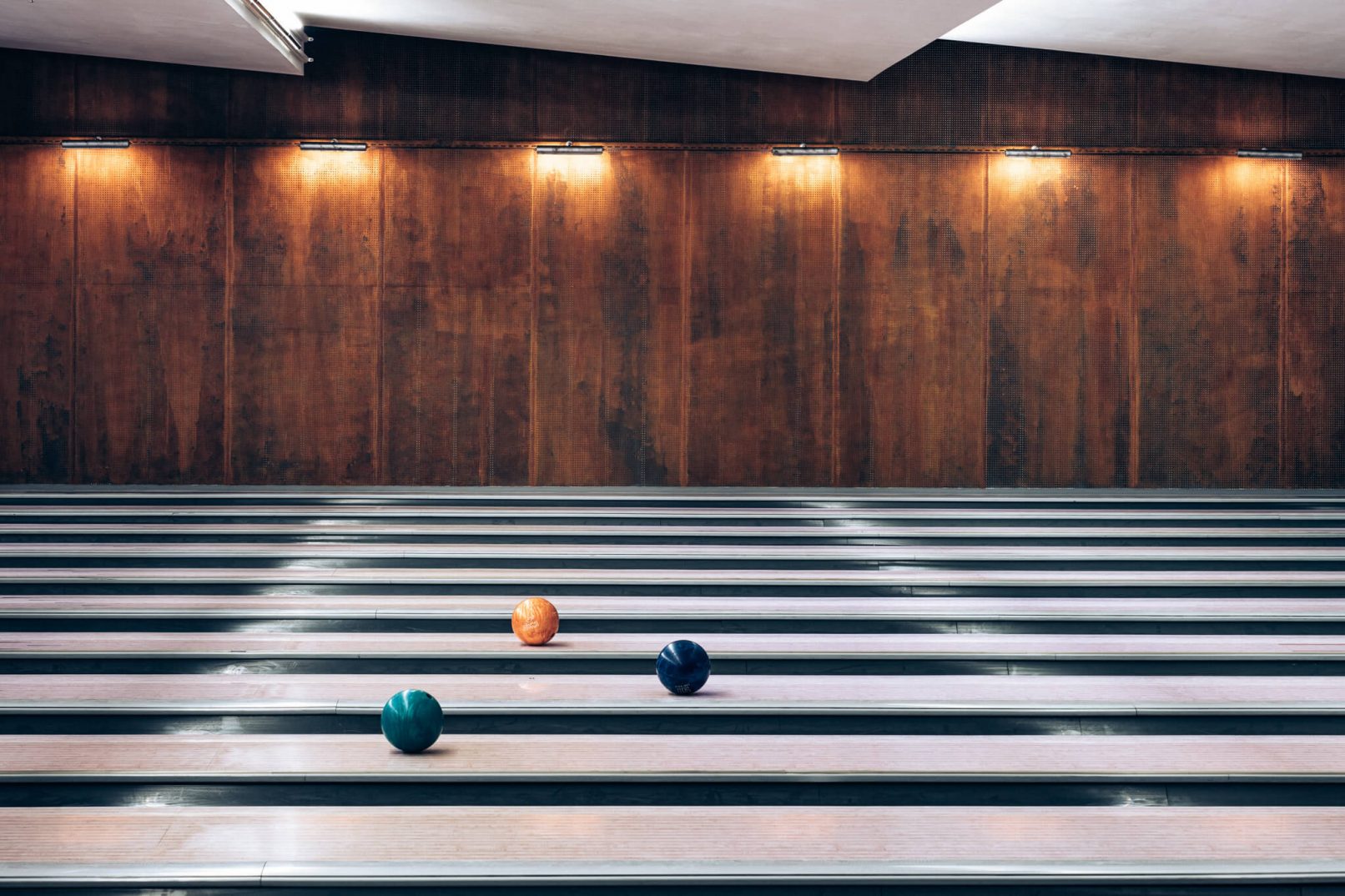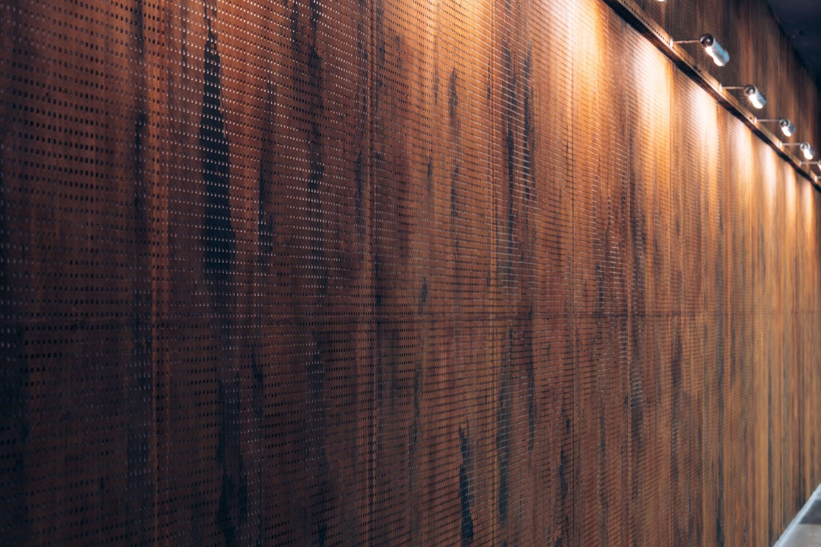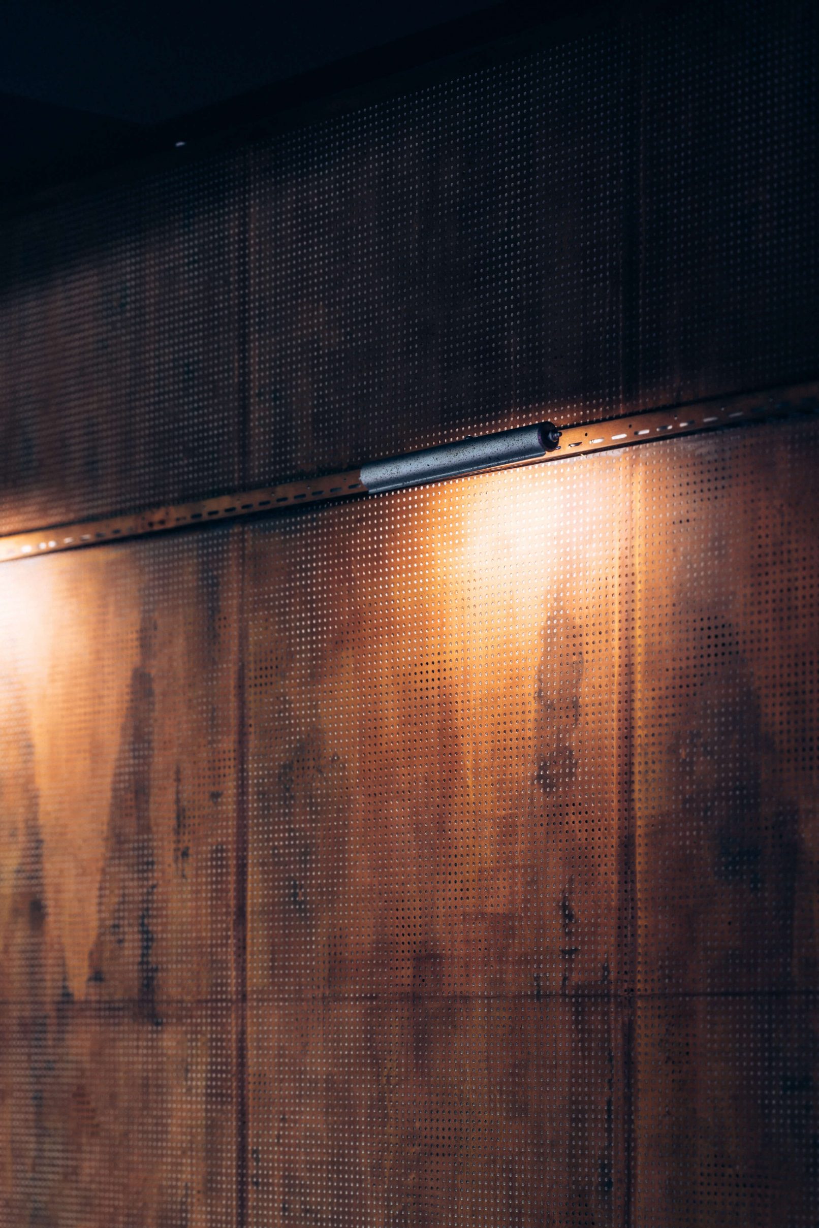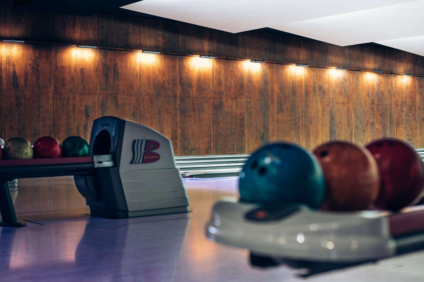 Novi lastnik je želel bowling center preoblikovati v zelo sodoben in obenem privlačen prostor, zato smo bele perforirane suhomontažne plošče na stenah ustvarjalno nadgradili. Nove stene, ki so po naši obdelavi pridobile videz starih železnih zarjavelih plošč, v prostor vnašajo industrijsko atmosfero in vznemirljiv pridih zgodovine, hkrati pa ga zaradi prevladujoče rjavine napolnijo s posebno toplino. Tako prostor deluje gostoljubno in sodobno hkrati.