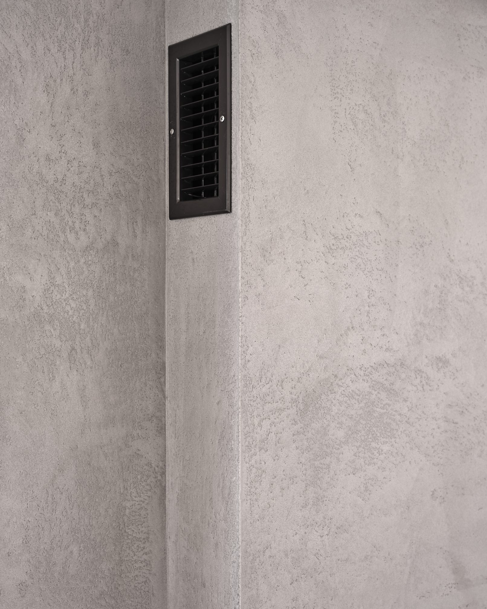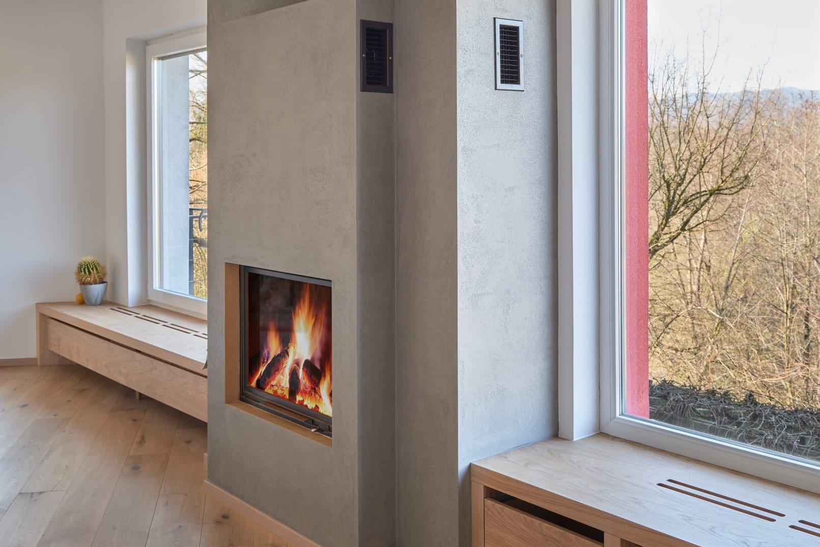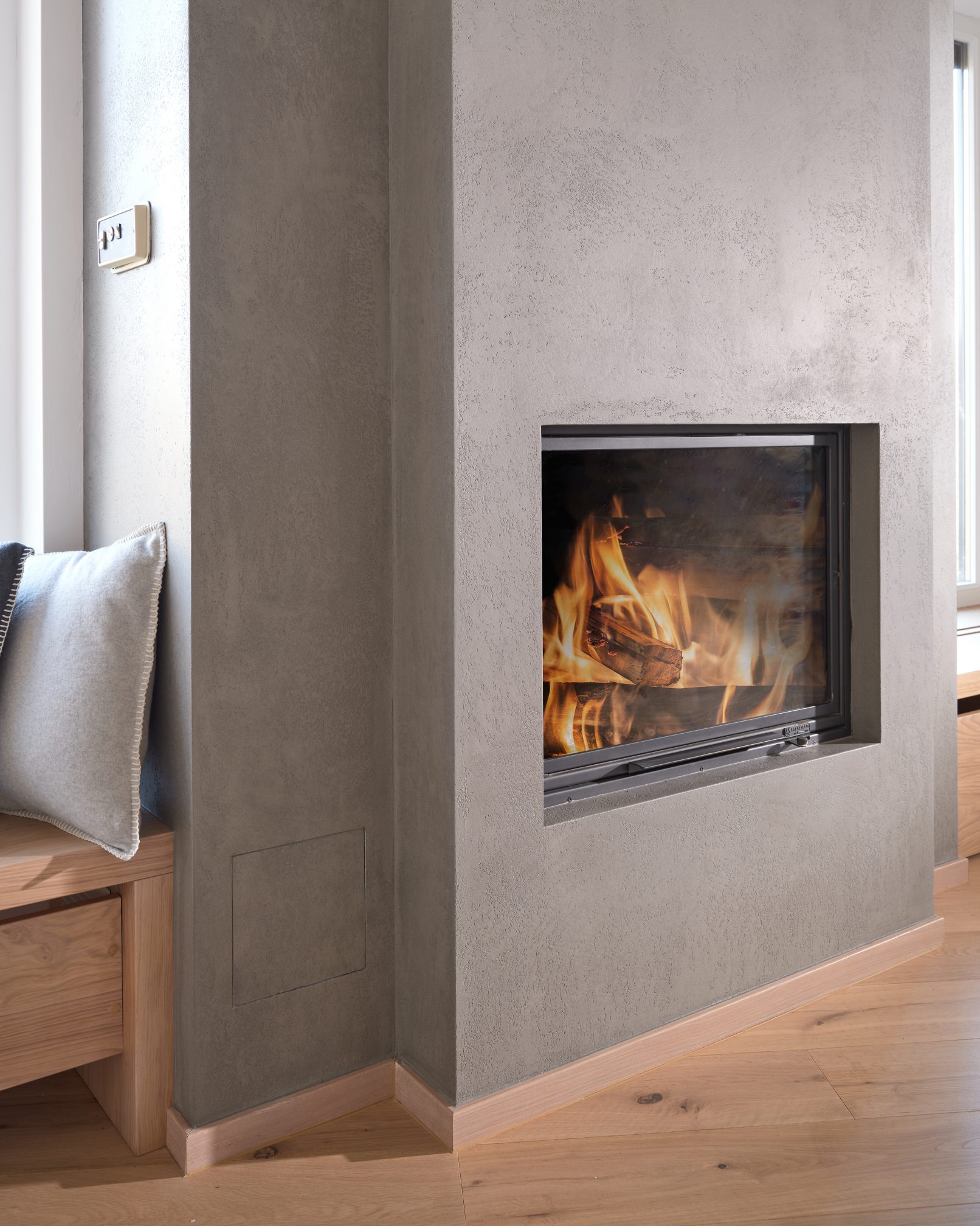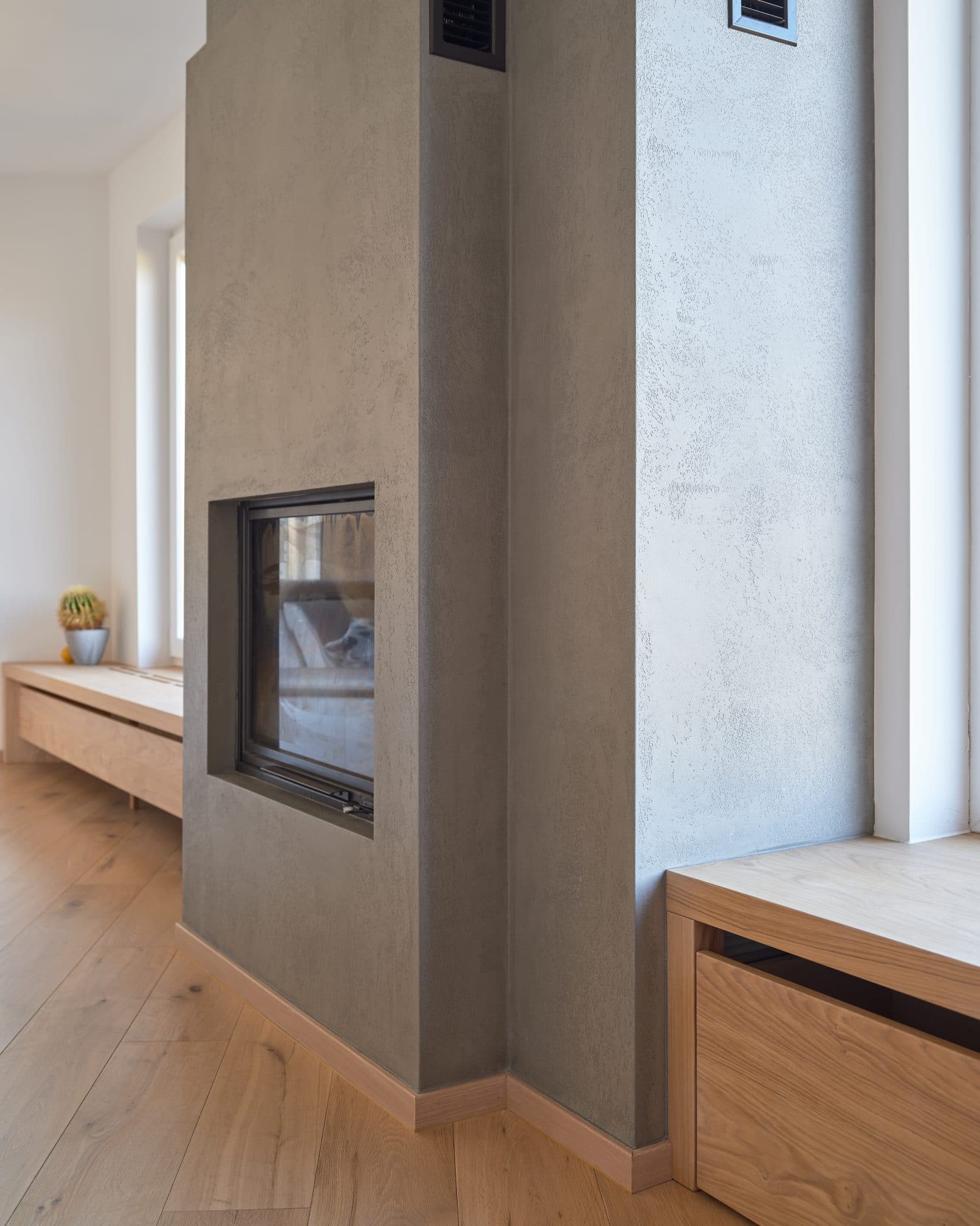 Za estetsko nadgraditev kamina v modernem dnevnem prostoru stanovanjske hiše v Pirničah smo uporabili dekorativni kit Cemento Meteore, ki ustvari efekt betona. Tako izbrana dekorativa je dodala malce industrijskega stila v sivi barvi, a je dnevni prostor kot celota še vedno ostal svetel in prefinjeno minimalističen.